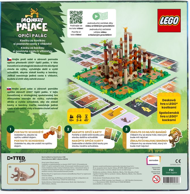 Hrajte proti sobě a zároveň pomozte opičce přestavět LEGO® Opičí palác. V této inovativní a strategické deskové hře důvtipně stavte do výšky, vytvářejte delší a vyšší schodiště, abyste získali kostky a banány.