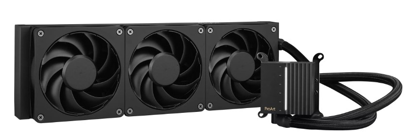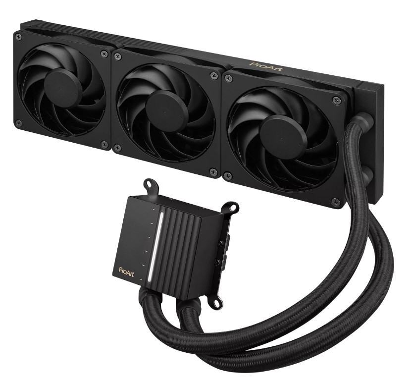 Kapalinový chladič CPU ProArt LC 360 vše v jednom s osvětleným měřičem stavu systému a třemi matně černými ventilátory Alphacool Apex Stealth Metal Power.
