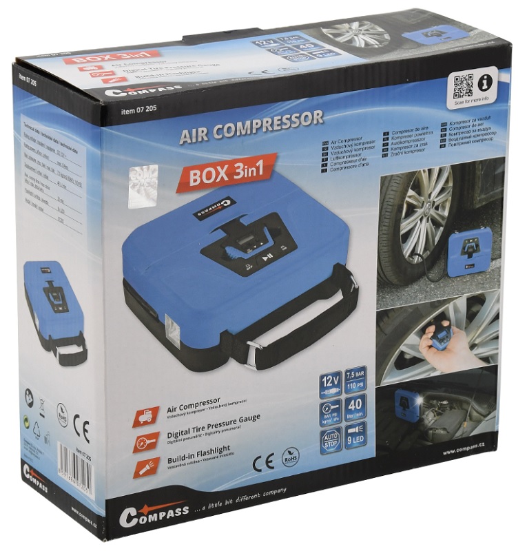 Digitální vzduchový kompresor Compass BOX v kompaktním přenosném provedení se stane vaším oblíbeným pomocníkem do auta. K napájení kompresoru slouží 280 cm dlouhý kabel zakončený 12V zástrčkou do autozapalovače. Díky funkci Auto stop nahustí pneumatiku na předem nastavený tlak a následně automaticky kompresor vypne.