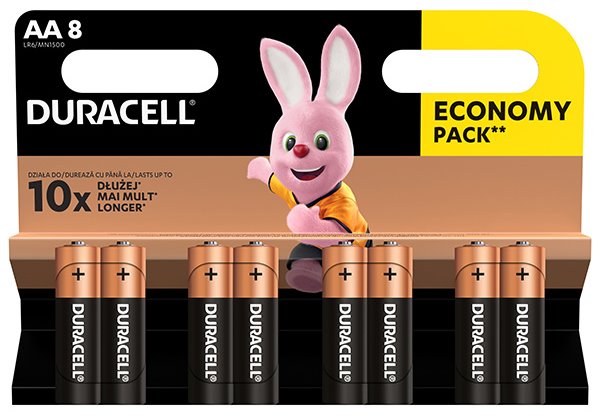 Baterie Duracell AA jsou víceúčelové alkalické baterie vhodné pro běžné přístroje, přístroje s velkým výkonem a pro přístroje s vysokou spotřebou Vydrží až 30x déle* (* v porovnání s předními zinkovými bateriemi ve standardním testu IEC 2015 digitálních