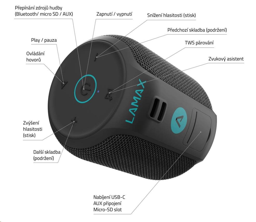 Reprák disponuje vstupy pro připojení přes microSD, USB-A a AUX.