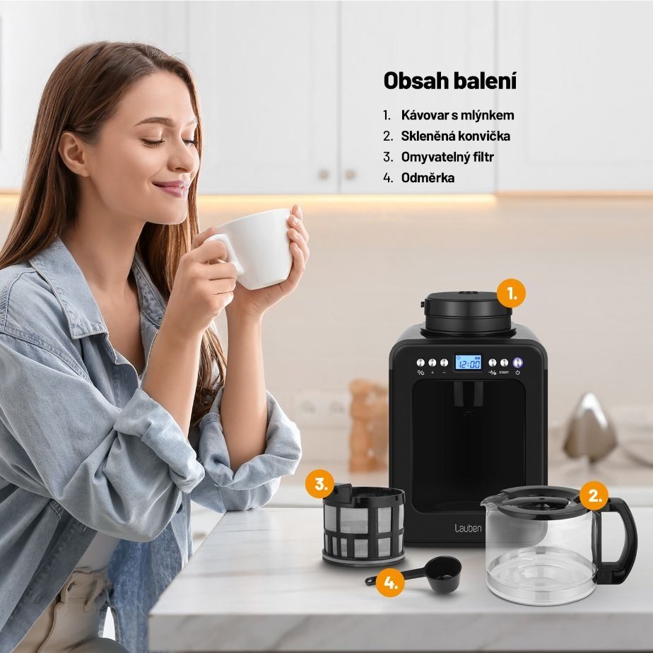 Dopřejte si každý den klidnou chvilku se šálkem lahodné překapávané kávy. Kávovar Lauben Grind&Drip Coffee Maker 600BB ji připraví během chvilky z čerstvě namletých zrn díky zabudovanému mlýnku. Nepotřebujete tak další příslušenství, odpadá i přesýpání kávy z mlýnku. Ač umí připravit také kávu z již namletých zrn, čerstvě umletá chutná nejlépe. Funkce Keep Warm navíc zajistí, že si nápoj užijete vždy horký. Vše potřebné nastavíte na přehledném digitálním displeji a pak už jen čekáte, než do skleněné konvice nakape černý mok. Čekání vás ušetří funkce časovače, která zajistí, že bude káva připravena na požadovanou dobu. Díky technologii Lauben AntiDrip® navíc umožňuje nalití kávy ještě před dokončením cyklu. Bezpečnost kávovaru prémiového kompaktního designu zajišťuje funkce automatického vypnutí a technologie Cool Touch. Čas uspoří snadná údržba, k níž přispívá také omyvatelný filtr z nerezové oceli. Není třeba stále dokupovat papírové jednorázové, takže šetří vaši peněženku a rovněž životní prostředí.