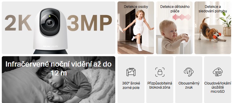 •Chytrá detekce - Inteligentně sleduje pohyb 24/7 a zajišťuje, že objekty zůstanou v dohledu i v úplné tmě díky nočnímu vidění. Přijímejte okamžitá upozornění na detekovaný pohyb, osoby nebo dětský pláč.