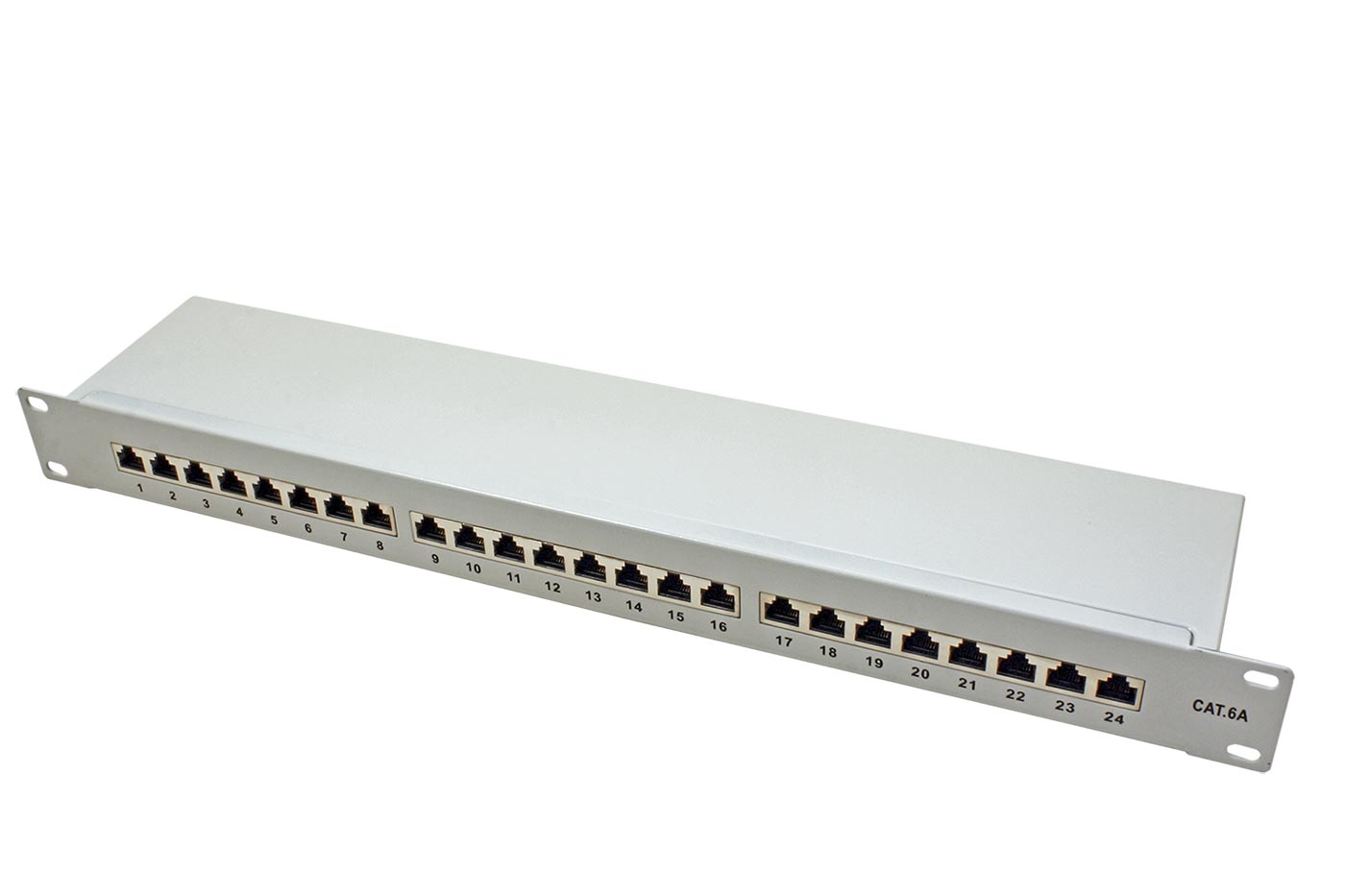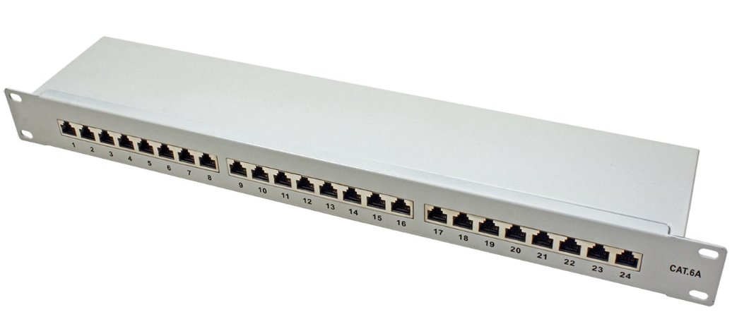 Stíněný, 24-portový patchpanel kategorie 6a pro montáž do 19“ rozvaděče (výška 1U).