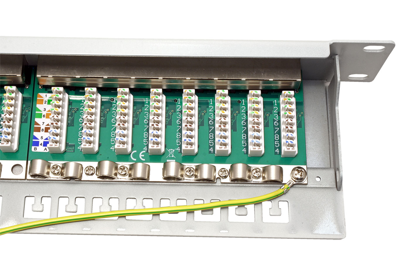Patchpanel pro strukturovanou kabeláž kat. 6a s nařezávacími konektory LSA+ pro zakončení kabelů pevné instalace.