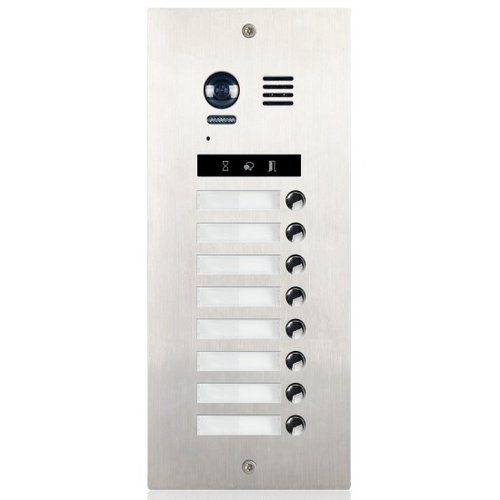Dveřní stanice pro multi-účastnické systémy s přímou tlačítkovou volbou. Barevná kamera, CCD 1/3" 105°, přímá tlačítková volba bytu/pokoje, reproduktor.