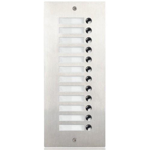 12 tlačítek s jmenovkami, jednořadové (jedno tlačítko = jedna jmenovka) podsvícení tlačítek nerezový kryt podomítková montáž, hloubka výseku 45mm, šířka 115mm, výška 299mm připojení na hlavní jednotku plochým kabelem