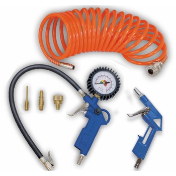 Sada obsahuje: Ofukovací pistole pro vyčištění nebo vysušení i hůře přístupných míst Pistole na plnění pneumatik s manometrem s gumovou ochranou, duální stupnicí (bar/PSI) a výpustným tlačítkem 5 m spirálová hadice pro snadné propojení nástrojů 3 různé druhy trysek pro různé druhy ventilů