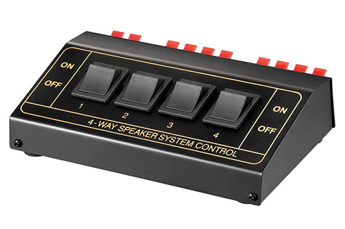 Přepínač audio signálu pro reproduktory 4:1. Pro připojení 4 sad reproduktorů k jednomu zdroji s možností ovládání (vyp/zap) každé sady zvlášť.