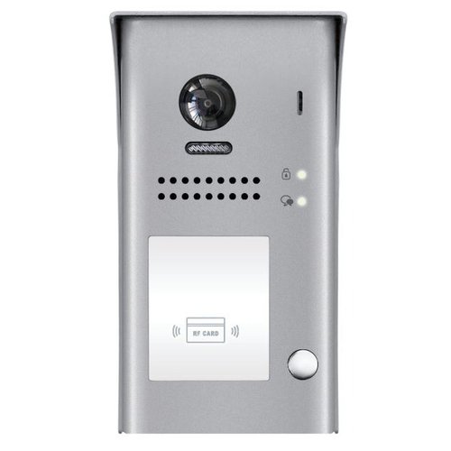 Dveřní stanice pro jednoúčastnickou instalaci s přímou tlačítkovou volbou s otevíráním vstupu pomocí RFID čtečky. 1x zvonek. Barevná kamera, CCD 1/3", širokoúhlý objektiv 170°, reproduktor. Ovládání jednoho zámku. Venkovní, stupeň krytí IP54, povrchová montáž.