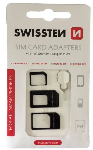Univerzální adaptér SWISSTEN pro micro SIM a nano Sim karty. Obsahuje adaptér z Nano SIM na Micro SIM, z Micro SIM na standardní SIM kartu, z Nano SIM na standardní SIM kartu a také eject pin key.