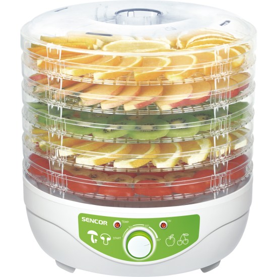 Sušička potravin vhodná k přípravě například: sušeného ovoce (křížal, švestek, meruněk, banánů atp.) rozinek sušené zeleniny do polévek sušených rajčat sušených bylinek bylinkových čajů (máta, lipový květ, heřmánek atp.) sušených hub do polévek a pokrmů sušených pomerančů na dekorace sušených dýňových semínek sušených okvětních lístků na vonné směsi sušeného masa sušených ryb Regulace teploty 35-80 °C 5 sušících sít v základní výbavě Úspora místa při provozu s menším počtem sít (možno již s jedním sítem) Průměr sušícího síta: 23 cm Užitná výška patra: 1,3 cm Integrovaný ventilátor napomáhá rovnoměrnému sušení na všech patrech Design mřížky sušících sít zabraňuje vzniku plísní a optimalizuje proudění vzduchu Průhledné víko a síta umožňují okamžitou vizuální kontrolu nad stavem sušení Sušící síta i víko je možno mýt v myčce nádobí Tepelná pojistka proti přehřátí Příkon: 250 W Délka přívodního kabelu: 0,9 m Rozměry (šířka × hloubka × výška): 230 × 230 × 190/230 mm Hmotnost: 1,3 kg Napětí a kmitočet: 220-240 V, 50 Hz