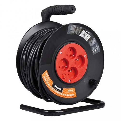 Prodlužovací kabel 230V na bubnu. Snadná manipulace, skladný. - oranžový kabel, černý buben - 250V, max. zatížení 16 A/3000W (max.zatížení 4,8 A/1100W navinutý) - baleno po 1ks - 4x zásuvka s tepelnou pojistkou, 1x zástrčka - délka kabelu 25m - p