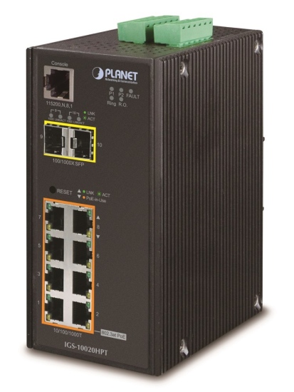 Porty: 8 x RJ-45 10/100/1000BASE-T, 2 x SFP 1000BASE-SX/LX/BX, 1 x RJ-45 sériový port konzole, 2 x DI/DO digitální logické rozhraní