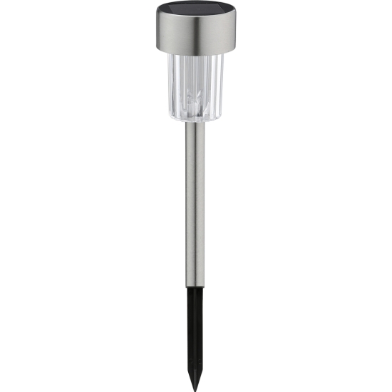 Solární zahradní zapichovací svítidlo Materiál nerez/plast 1x LED (DIP) studená bílá 0,08W/2V amorfní solární článek Ni-Mh akumulátor AAA 1,2V 200mAh Patice: pevně vestavěná LED Doba svícení 8 hodin Barva světla 7500K IP44 Rozměry 62x339mm Světelný tok 1,2 lm