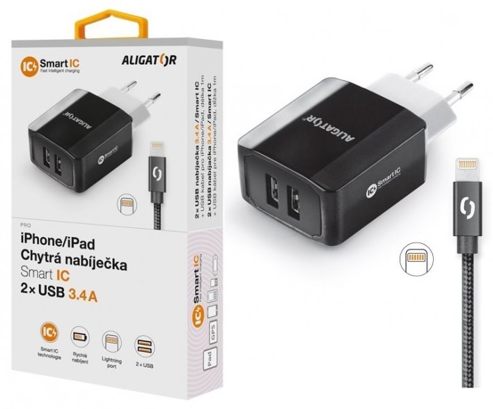 Chytrá síťová nabíječka ALIGATOR 3.4A, 2xUSB, smart IC, černá, kabel pro iPhone/iPad 2A