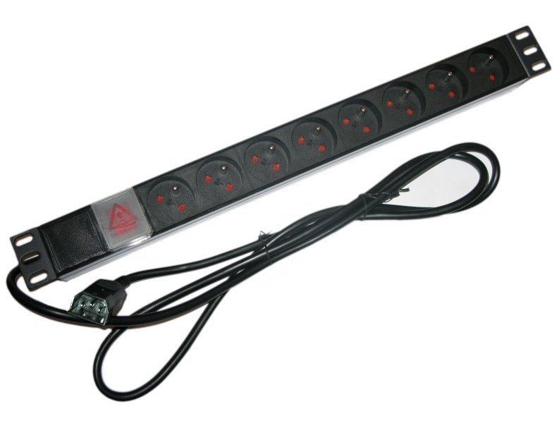 19" rozvodný panel 8x 230V, zásuvky dle ČSN, vypínač, indikátor napětí, Výška 1U, zakončeno přívodním kabelem IEC320 C14.