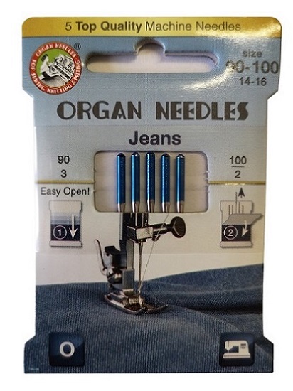 Džínové jehly mají ostrý hrot pro snazší vniknutí do pevně tkané látky bez ohnutí jehly. Pro plátno, džínovinu, mikrovlákna. Jsou určeny do domácích šicích strojů.