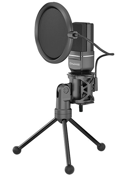 Mikrofon lze snadno upevnit do stativu s kovovými nožičkami zakončenými pogumovanými násadkami, aby stativ neklouzal po stole. Pro upevnění slouží gumičky, které mikrofon drží na místě a zároveň zabraňují přenosu hluku v případě, že byste o stativ nechtěně zavadili. Bez těchto gumiček by byl přenesen i hluk mikrofonu narážejícího na stěny stativu. Sklon mikrofonu pak můžete zaaretovat v jakémkoliv úhlu sklonu.