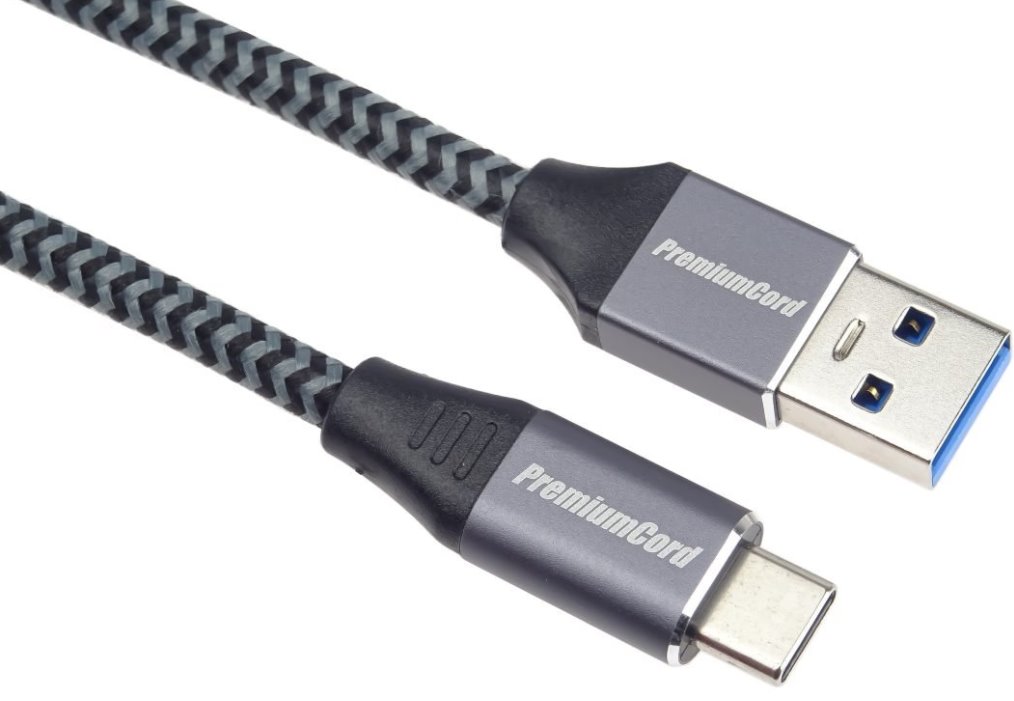 PremiumCord kabel USB-C - USB 3.0 A (USB 3.1 generation 1, 3A, 5Gbit/s) 1m bavlněný oplet a kovové hliníkové konektory - První konektor: USB 3.1 typ C samec - Druhý konektor: USB 3.0 typ A samec - Přenosová rychlost: Super-speed 5Gbit/s, až 10x ryc