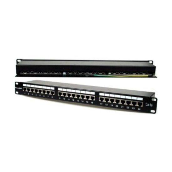 Propojovací panel, 24 portů RJ-45 Cat.5e, stíněný. Kontakty jsou na svorkovnici odlišeny barvami podle typu zapojení, a to buď podle T568A, nebo T568B nebo číselně značeny.