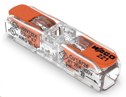 Svorka kabelová 2PIN s páčkami, 250V, 32A, 2x 4 mm2 (222-412) Max. napětí 250 V AC Max. proud 32 A Krytí IP20 Pracovní teplota - 40°C až + 85°C Rozměry 12,5 x 14,5 x 20,5 mm Přívodní vodič 2x 0.08 - 4.0 mm2