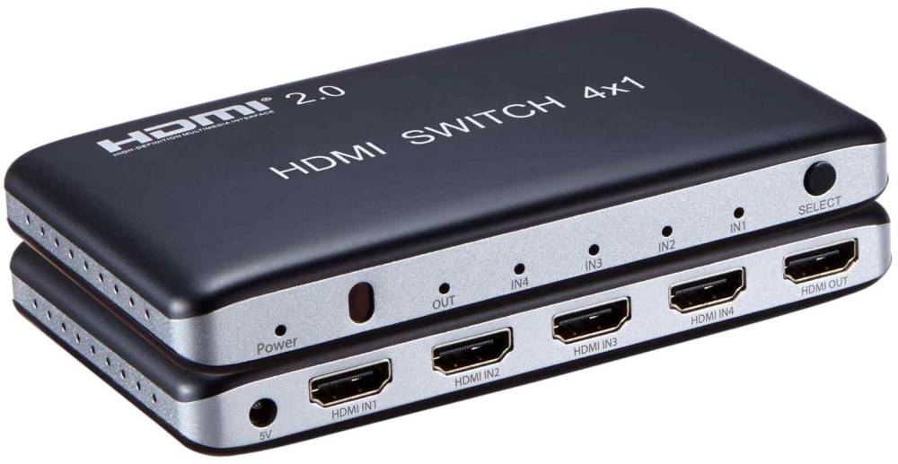 4 vstupní HDMI zařízení sdílejí 1 výstupní monitor, projektor. Výběr vstupních zařízení: 1.automaticky, 2.stisknutím tlačítka na čele přepínače, 3.dálkovým ovladačem