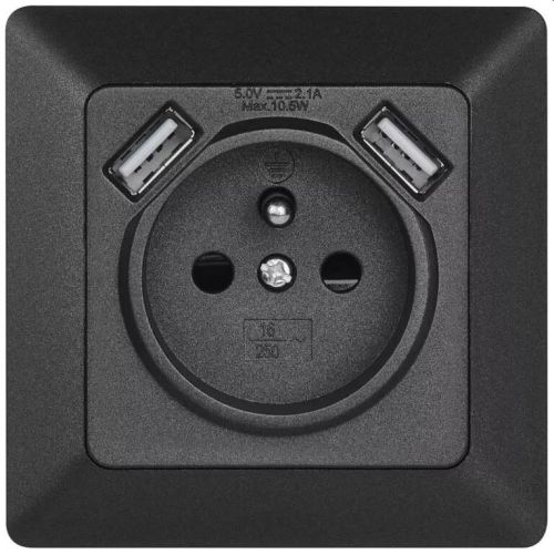Zásuvka jednonásobná s ochranným kolíkem s USB nabíjením. USB výstup 5 V DC 2,1 A max.
