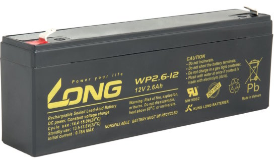 Parametry: Konektory: F1 Napětí: 12V Kapacita: 2,6Ah Rozměry (d x š x v): 178 x 35 x 60mm Rozměrové tolerance: 178(+1-1) x 34,5(+1-1) x 60(+1-1)mm Hmotnost: 1kg Elektrolyt: AGM Typ akumulátoru: Standard Životnost: 3-5 let (dle normy Eurobat nebo v pohotovostním režimu "Standby")