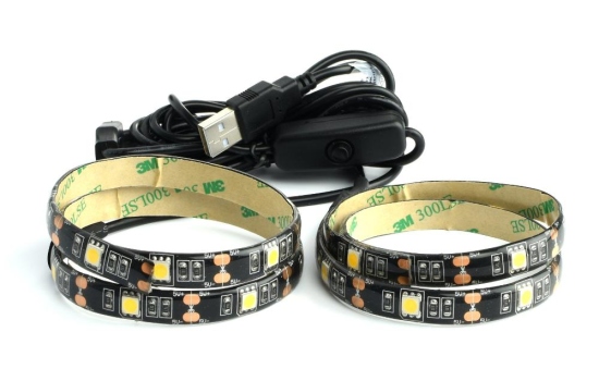 Bílý LED pásek 2×50cm do konektoru USB. Ideální pro podsvícení televizorů a monitorů a pro různá dekorativní podsvícení. Zapojuje se do USB konektoru televizoru. LED pásky se pomocí oboustranné lepící pásky upevní na požadované místo. Produkt omezuje únavu při práci s PC nebo při sledování televize.