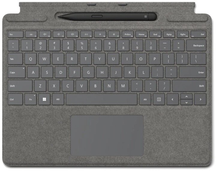 Klávesnice a pero Slim Pen 2 v jednom, navržená pro pohodlné psaní. Nízkoprofilové klávesy. Skvělá ergonomie. Podsvícené LED klávesy. Skleněný touchpad nahrazující myš. Luxusní kryt z Alcantary. Kompaktní rozměry pro maximální skladnost. Anglická lokalizace kláves. Podpora technologie Bluetooth 5.0 pro připojení dalších zařízení. 4096 úrovní tlaku pera, nesilový rukopis. Kompatibilní se zařízeními Surface Pro 8 a Surface Pro X.