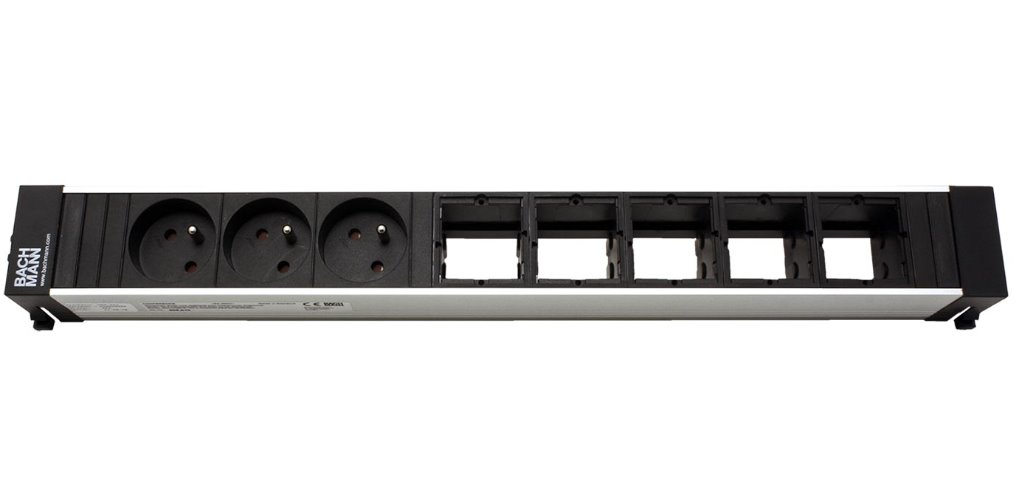 Box se 3 napájecími zásuvkami a 5 volnými pozicemi, určený pro montáž do rámu systému CONFERENCE nebo TOP FRAME.