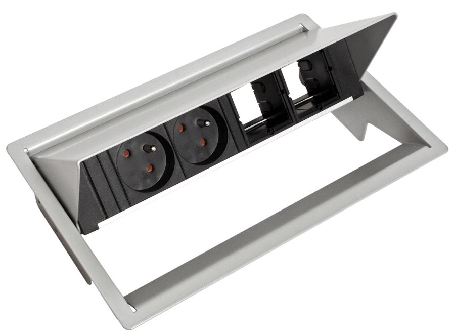 Elegantní, výklopné přípojné místo v úrovni stolu. Umožňuje snadnou montáž do otvoru v desce stolu. Box s uživatelsky konfigurovatelnými moduly. Po zapojení je možno držák sklopit a přípojné místo tak nevyčnívá nad úroveň stolu. Nízká vestavná hloubka dovoluje montáž i ve stísněných prostorech.