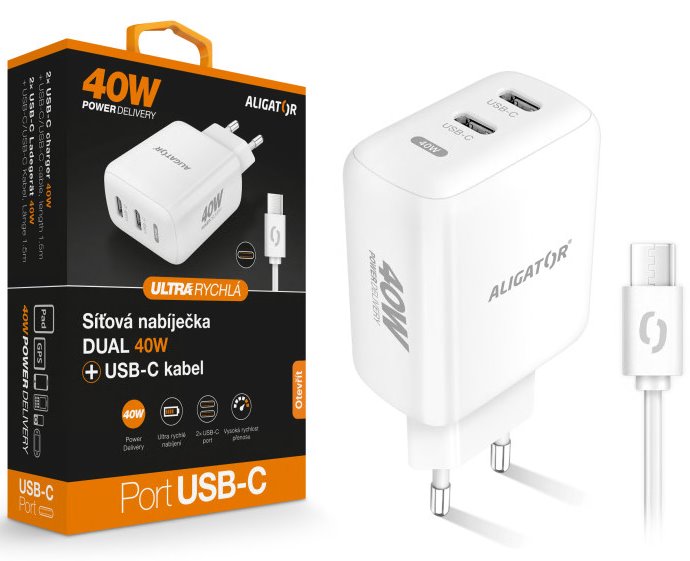 Rychlá síťová nabíječka 2xUSB-C ALIGATOR Power Delivery 40W s kabelem USB-C/USB-C