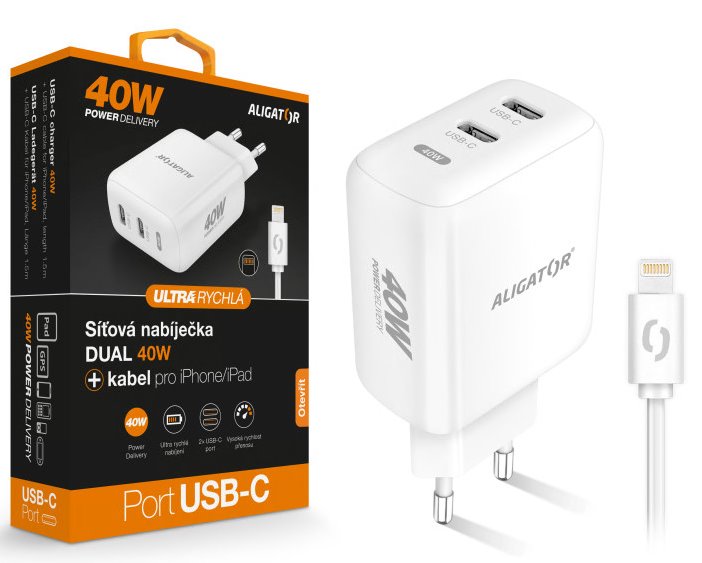 Rychlá síťová nabíječka 2xUSB-C ALIGATOR Power Delivery 40W s kabelem USB-C/Lightning pro iPhone/iPad