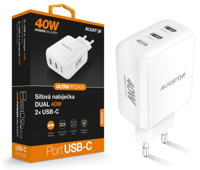 V dnešní době jsou již konektory USB-C s podporou protokolu PD standardem pro nabíjení mobilních zařízení. Chytrá síťová nabíječka ALIGATOR POWER DELIVERY 40W zvládne tak hravě doplnit energii dvěma přístrojům najednou díky ultra rychlým USB-C portům o celkovém výkonu až 40W. Tato nabíječka je ideálním pomocníkem pro dobíjení mobilních telefonů, tabletů a jiných zařízení.