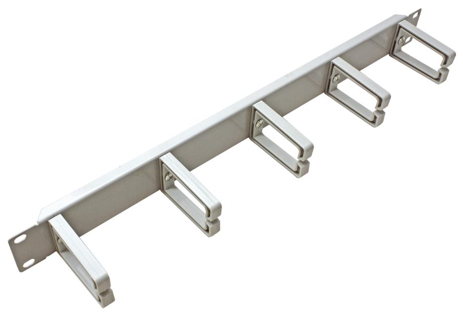 Kovový panel s plastovými třmeny pro horizontální vedení kabelů v 19" rozvaděči.