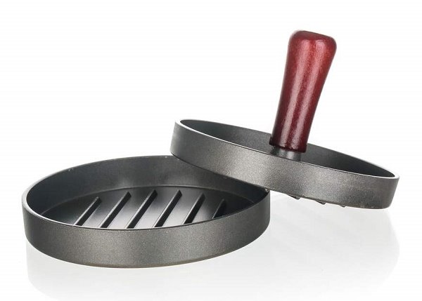 Forma na výrobu hamburgerů z mletého masa vyrobená z litého hliníku a opatřená nepřilnavým povrchem doplněna dřevěným madlem, průměr 12 cm, celková výška 8 cm.