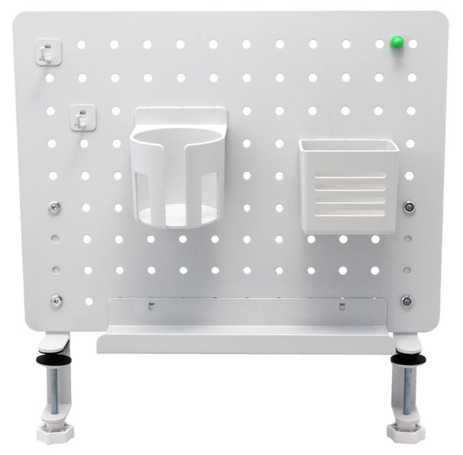 Děrovaná deska se sadou držáků montovaná na kraj stolu.