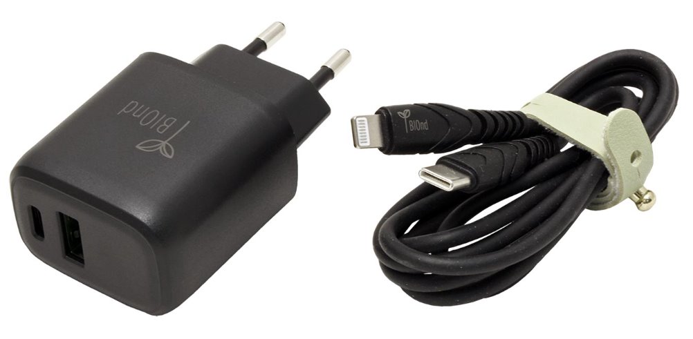 Síťový napájecí adaptér 5V ~ 12V s konektorem USB C PD (Power Delivery) a USB A QC. Sada adaptér + kabel. V provedení BIOnd (recyklované materiály, obaly bez plastů).