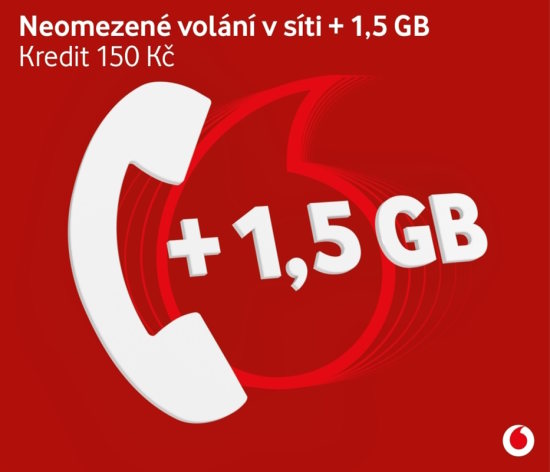 Předplacená SIM karta obsahující neomezené volání v síti Vodafone + 1,5 GB dat v hodnotě 149 Kč na první měsíc + 150 Kč extra kredit s platností 45 dní. 3 Kč za minutu volání, SMS nebo 10 MB dat.