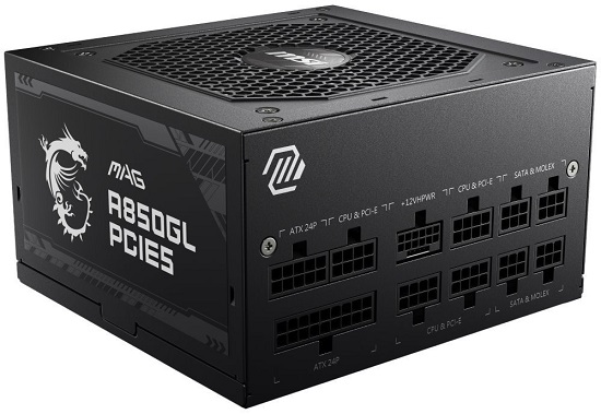 Napájecí zdroj o výkonu 850 W je osazen 120mm ventilátorem. Zdroj splňuje certifikaci 80PLUS Gold.