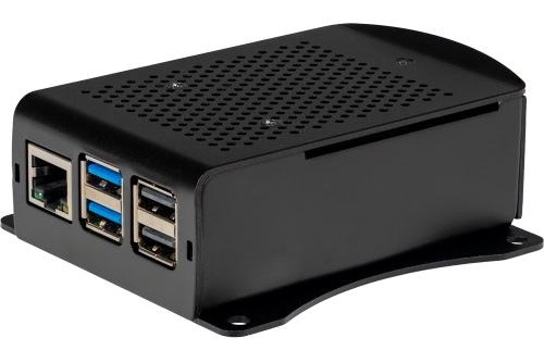 Hliníková krabička v černém provedení pro Raspberry Pi 5 s možností uchycení na zeď a 40mm aktivním ventilátorem.