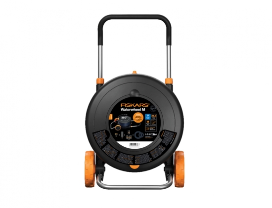 Vozík s bubnem a hadicí FISKARS M. Sada připravená k použití, integrovaná praktická schránka s příslušenstvím (multi spojka ke kohoutku, zavlažovací koncovka). Libovolné umístění 360 stupňů rotace bubnu umožňují zavlažovat mimořádně velkou plochu. Celkový dosah až 21,5 m. Odolná 13 mm (1/2 palce) hadice. Pohodlný vozík pro snadné přemísťování bubnu. Snadné odvíjení a navíjení hadice. Pohodlné ovládání díky horizontálnímu provedení bubnu. Disponuje univerzálním připojením, je tedy kompatibilní i s jinými značkami. Rozměry: délka 56,6 cm, šířka 39,8 cm, výška 25 cm. Hmotnost 5,6 kg.