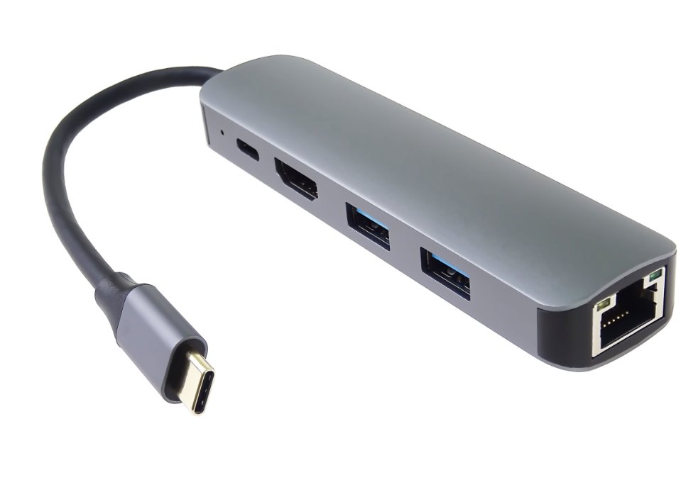 - Víceportový adaptér USB-C obsahuje vysokorychlostní port Ethernet / RJ-45, nabíjecí port 100W PD, dva porty USB 3.2 , video výstup 4K HDMI