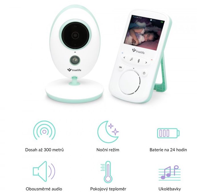 TrueLife NannyCam V24 Pro – Digitální video chůvička TrueLife Oblíbená chůvička, ověřena zákazníky, TrueLife NannyCam V24 ve vylepšené verzi je tu. TrueLife NannyCam V24 Pro je digitální video chůvička s přehledným barevným 2,4 palcovým LCD displejem, pokojovým teploměrem, automatickým nočním módem a moderním USB-C připojením pro rychlé a spolehlivé nabíjení. Přenos zvuku i obrazu je vysoce kvalitní ve dne i v noci. Můžete být v klidu a mít jistotu, že je s Vašimi blízkými vše v pořádku, protože použitá digitální technologie s frekvencí 2.4 GHz zaručuje bezpečný a stabilní signál.