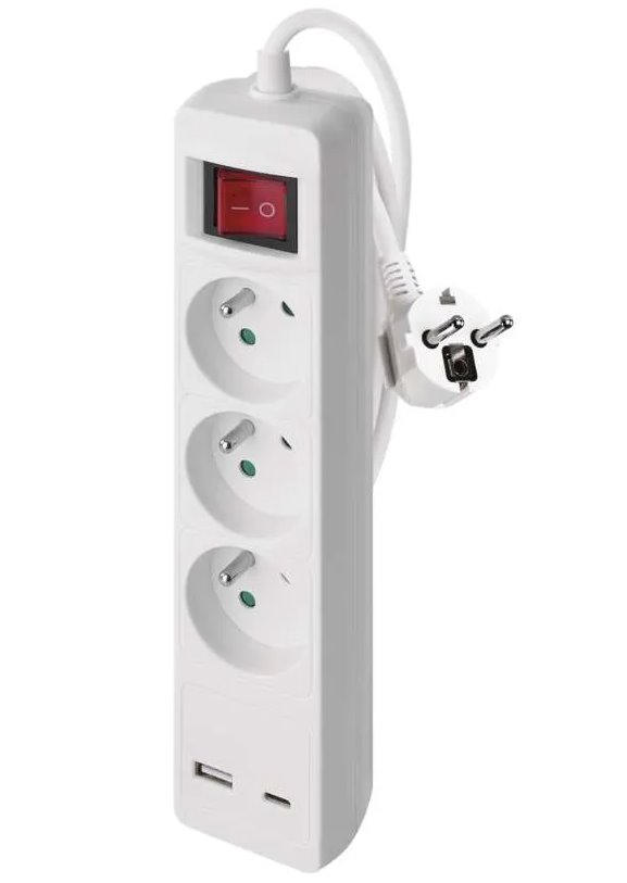 Prodlužovací kabel 2 m / 3 zásuvky / s vypínačem / bílý / 1×USB-A + 1×USB-C / 1,5 mm2