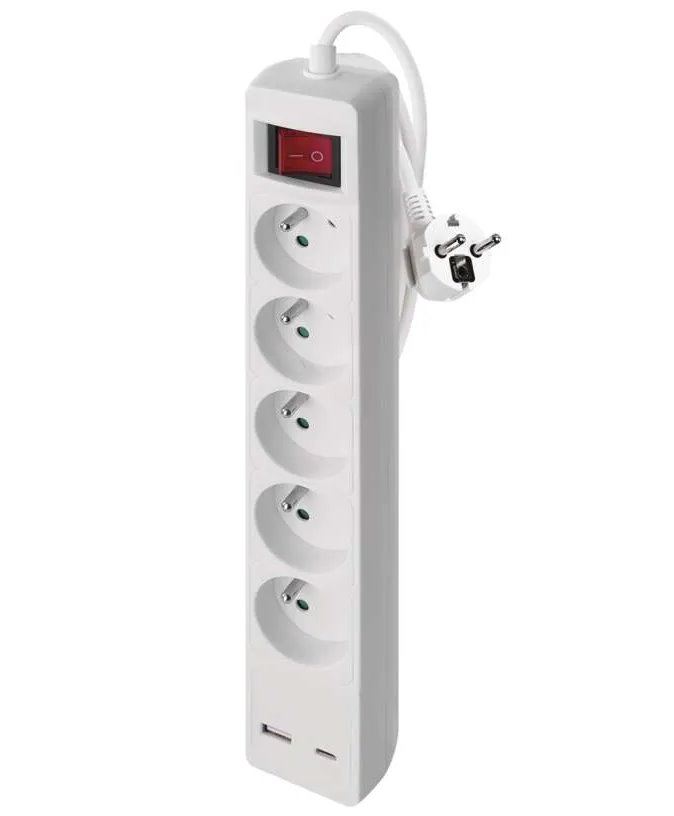 Prodlužovací kabel 3 m / 5 zásuvky / s vypínačem / bílý / 1×USB-A + 1×USB-C / 1,5 mm2