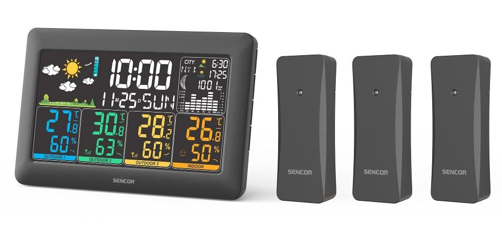 Ikona předpovědi počasí (slunečno, mírně oblačno, oblačno, déšť, sněžení) Předpověď na 12 ~ 24 hodin založená na změně tlaku a teploty vzduchu Měření vnitřní teploty a vlhkosti s indikátorem komfortu a vývoje Měření venkovní teploty a vlhkosti s indikátorem vývoje Rádiem řízené hodiny pomocí signálu DCF77 (možnost ručního nastavení) Hodnota barometrického tlaku Sloupcový graf pro změny tlaku (-1, -2, -3, -6, -12 hodin) Digitální čas, Datum a den v týdnu Čas východu / západu slunce Zobrazení měsíční fáze Indikace úrovně komfortu (3 úrovní) Max. / Min. záznamy v paměti (24h) Budík s funkcí opakovaného buzení Rozsah měření vnitřní teploty: -20 až +50°C Rozsah měření venkovní teploty: -40°C až +60°C Rozsah měření vlhkosti 1% až 99% RV 12 / 24 hodinový formát Zobrazení stupnice teploty °C / °F 5 úrovně jasu displeje Umístění na stůl Indikátory vybitých baterií (pro hlavní jednotku i venkovní senzor) Možnost připojení až tří senzorů 3 senzory součástí balení ( SWS TH6300 ) Přenos na vzdálenost - až do vzdálenosti 80 m ( v otevřeném prostoru ) Frekvence vysílání senzoru: 433,92 MHz Napájecí adaptér hlavní jednotky: DC 5 V / 1200 mA (součást příslušenství), Spotřeba: 6 W Záložní baterie hlavní jednotky: 3 x 1,5 V typ AA (baterie nejsou součástí balení) Napájení senzoru: 2 x 1,5 V typ AA ( baterie nejsou součástí balení ) Rozměry hlavní jednotky: ( š / v / h ) 200 x 129 x 30 mm Hmotnost hlavní jednotky: 337 g