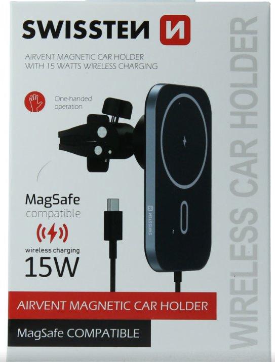 Magnetický držák Swissten do větrací mřížky s bezdrátovým dobíjením kompatibilním s MagSafe a vysokým výkonem 15W. Baleno v blistru SWISSTEN.